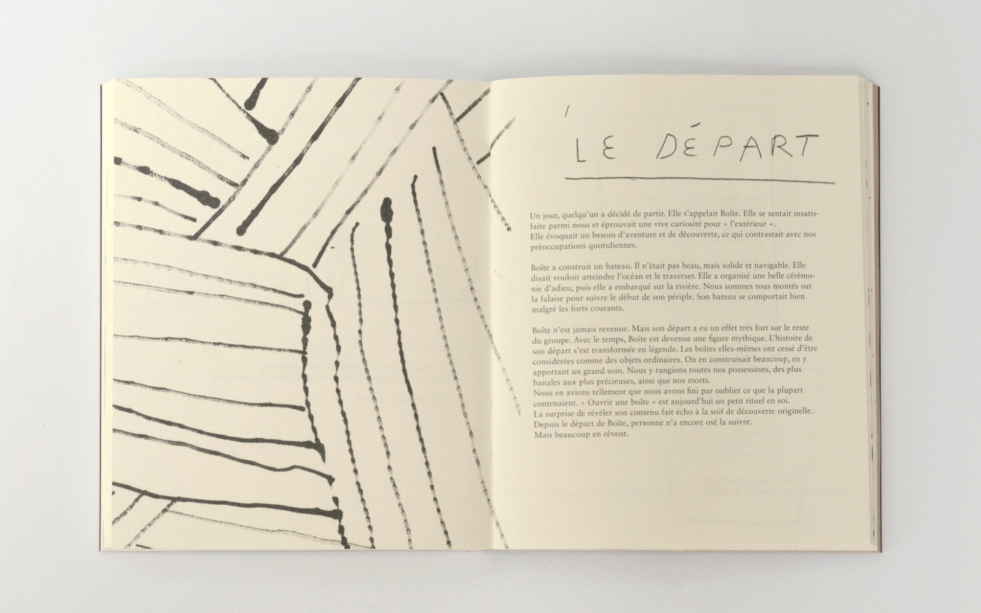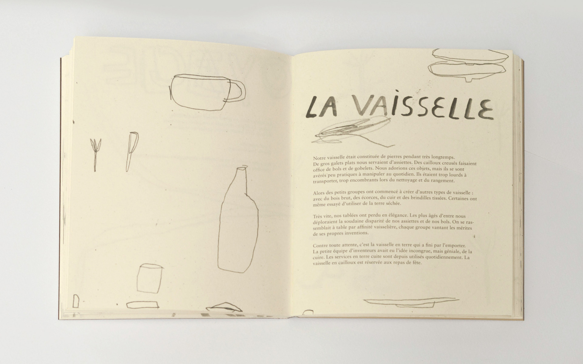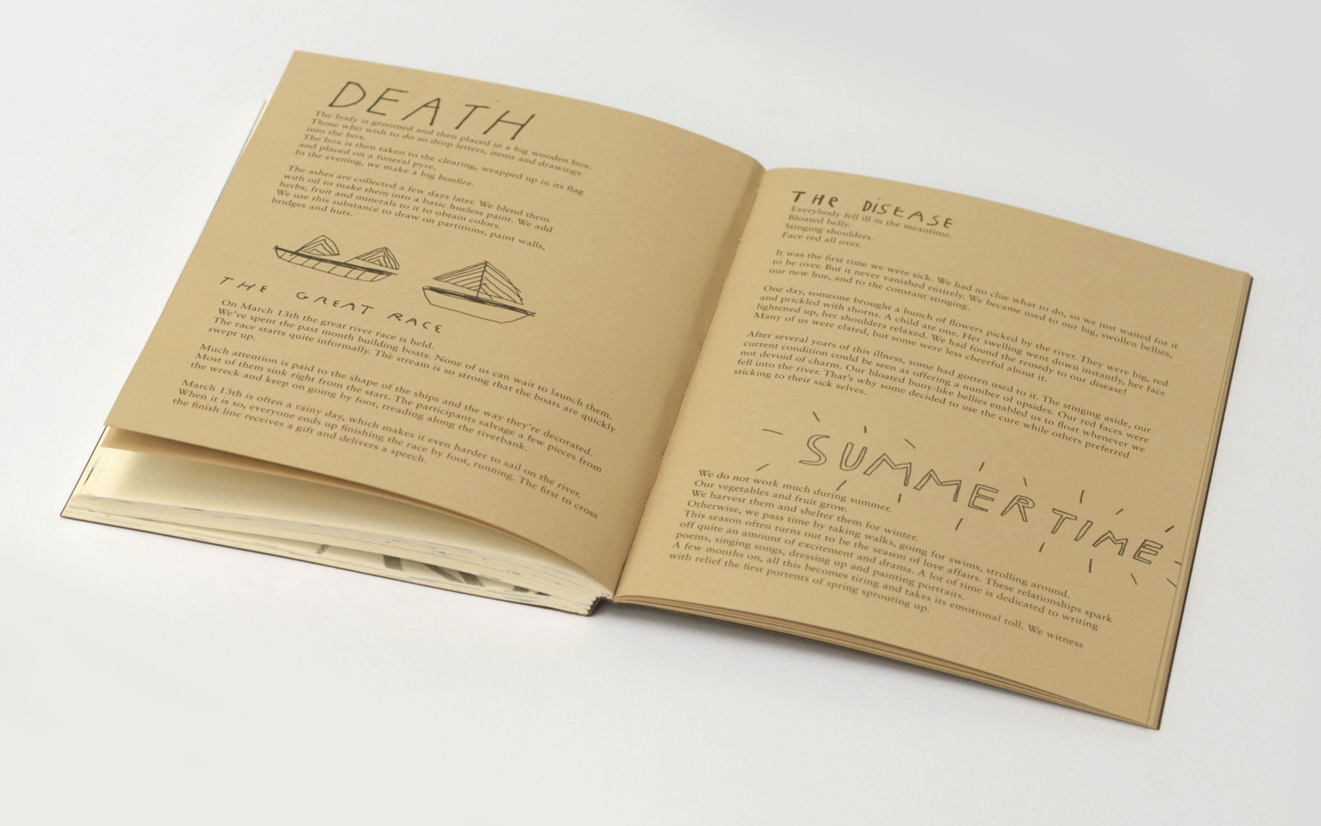 Construire un lac, faire disparaître des cailloux, porter un chapeau raconte l’existence d’un groupe d’humains qui vit dans la forêt. Une trentaine de chapitres décrit différents aspects de leur vie : leur manière de se nourrir, leurs jeux, leurs rituels funéraires, leurs fêtes, leurs coutumes... Ils passent beaucoup de temps à construire des radeaux magnifiques qui coulent dès leur mise à l’eau. Ils creusent un très grand lac pour le simple plaisir d’y accueillir des oiseaux aquatiques. Leurs projets ambitieux se traduisent souvent par des échecs, mais on dirait que rien n’est grave.